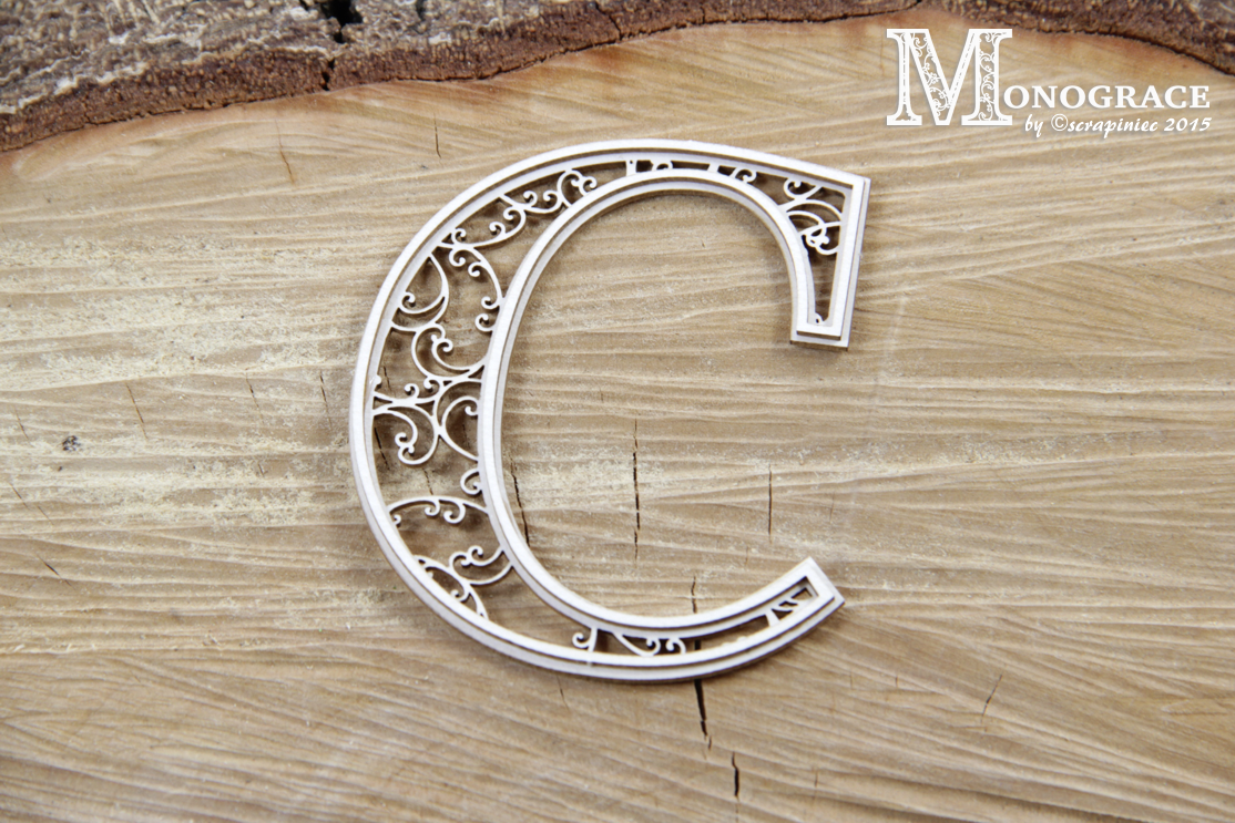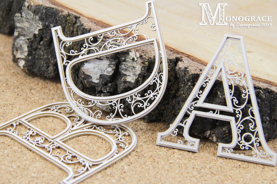 Two-layer monogram made of 1,2 mm thick natural white chipboard.