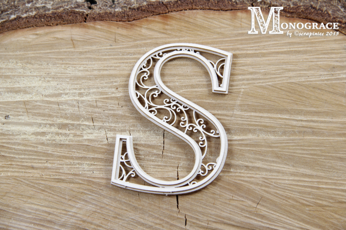 Two-layer monogram made of 1,2 mm thick natural white chipboard.