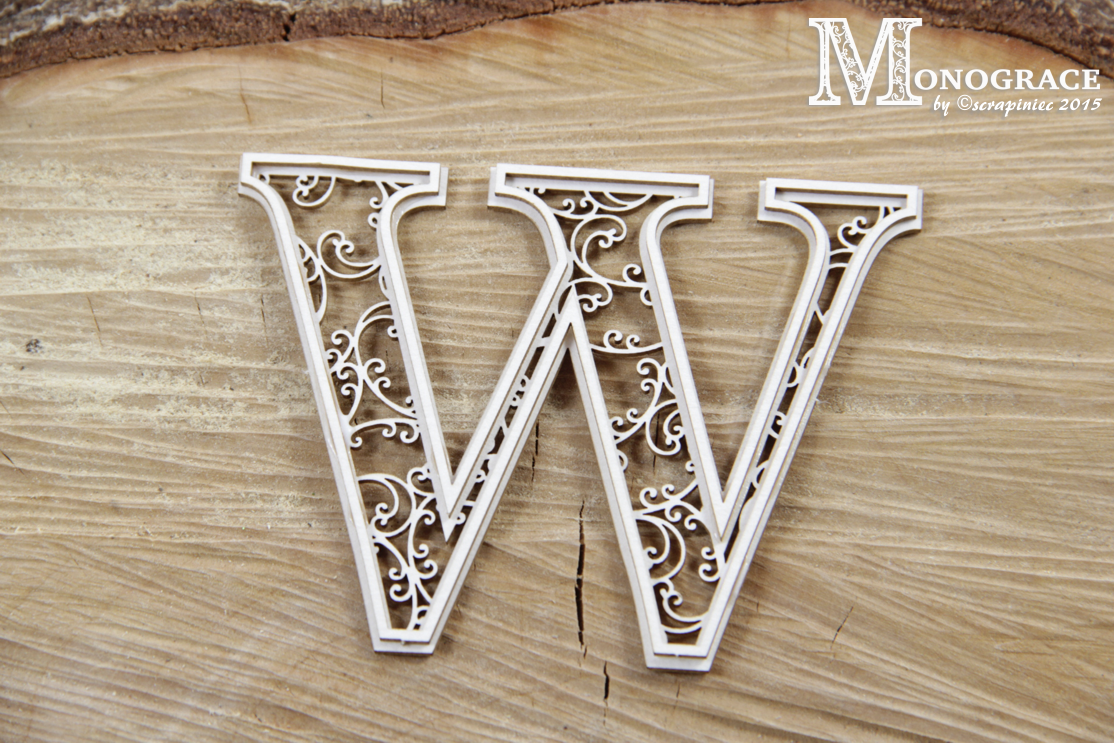 Two-layer monogram made of 1,2 mm thick natural white chipboard.