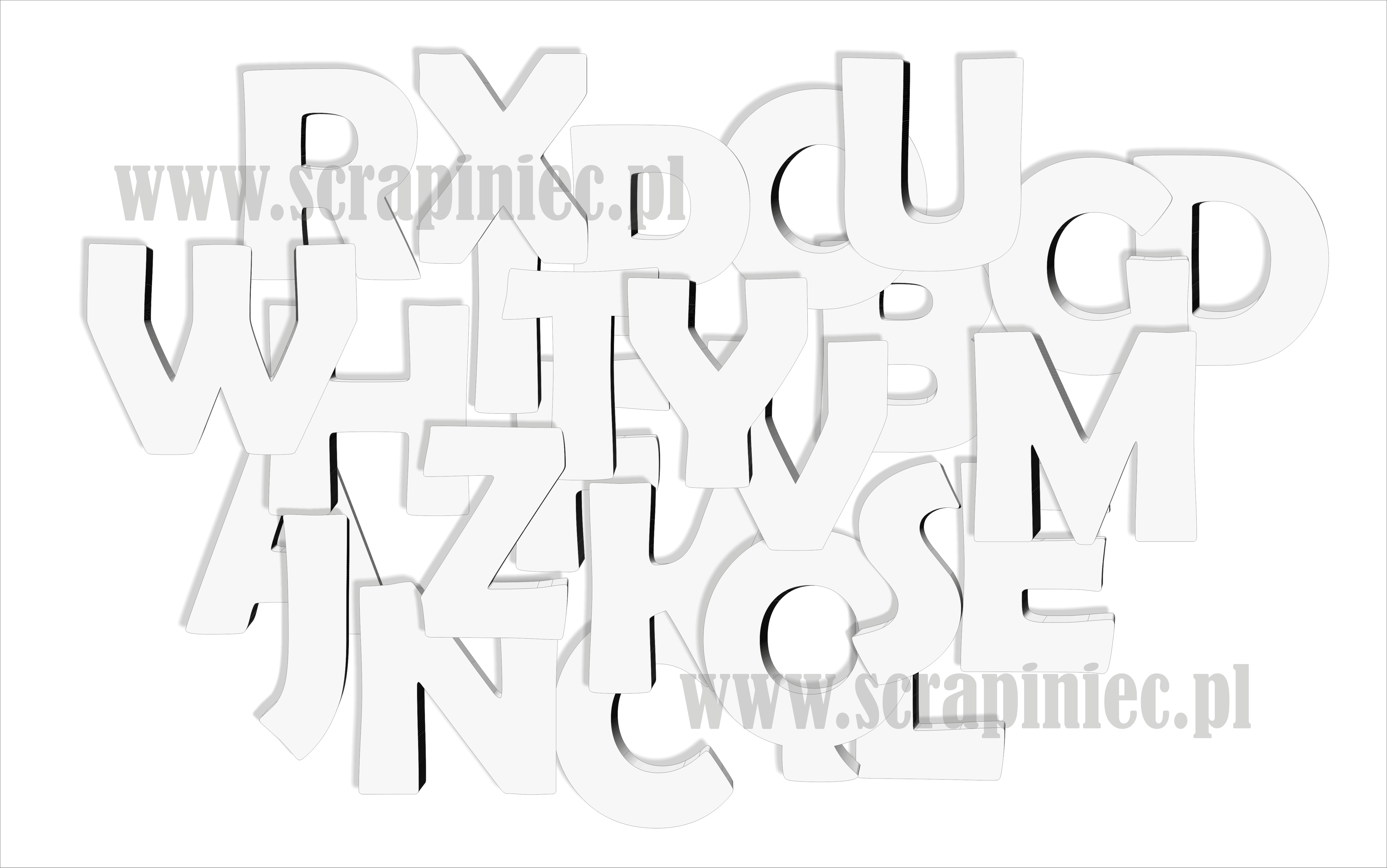 Alfabet złożony z liter o wysokości 6 cm lub 10cm. Wykonany z białej tekturki o grubości 1,2 mm..