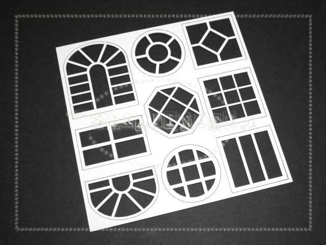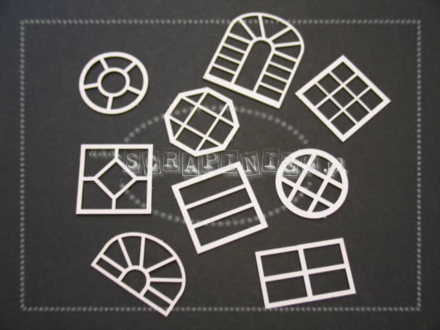 Zestaw 9 różnych okienek w arkuszu 14x14 cm. Wykonany z białej tekturki 1,2 mm.