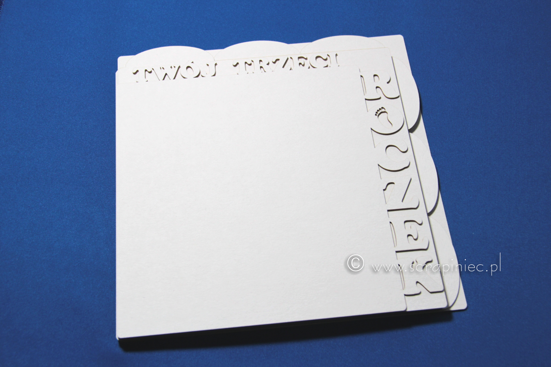 Baza albumu złożona z okładki z ażurowym napisem, 6 kart z przekładkami na poszczególne miesiące oraz karty prostej na tył albumu. Wymiary 20x20 cm.